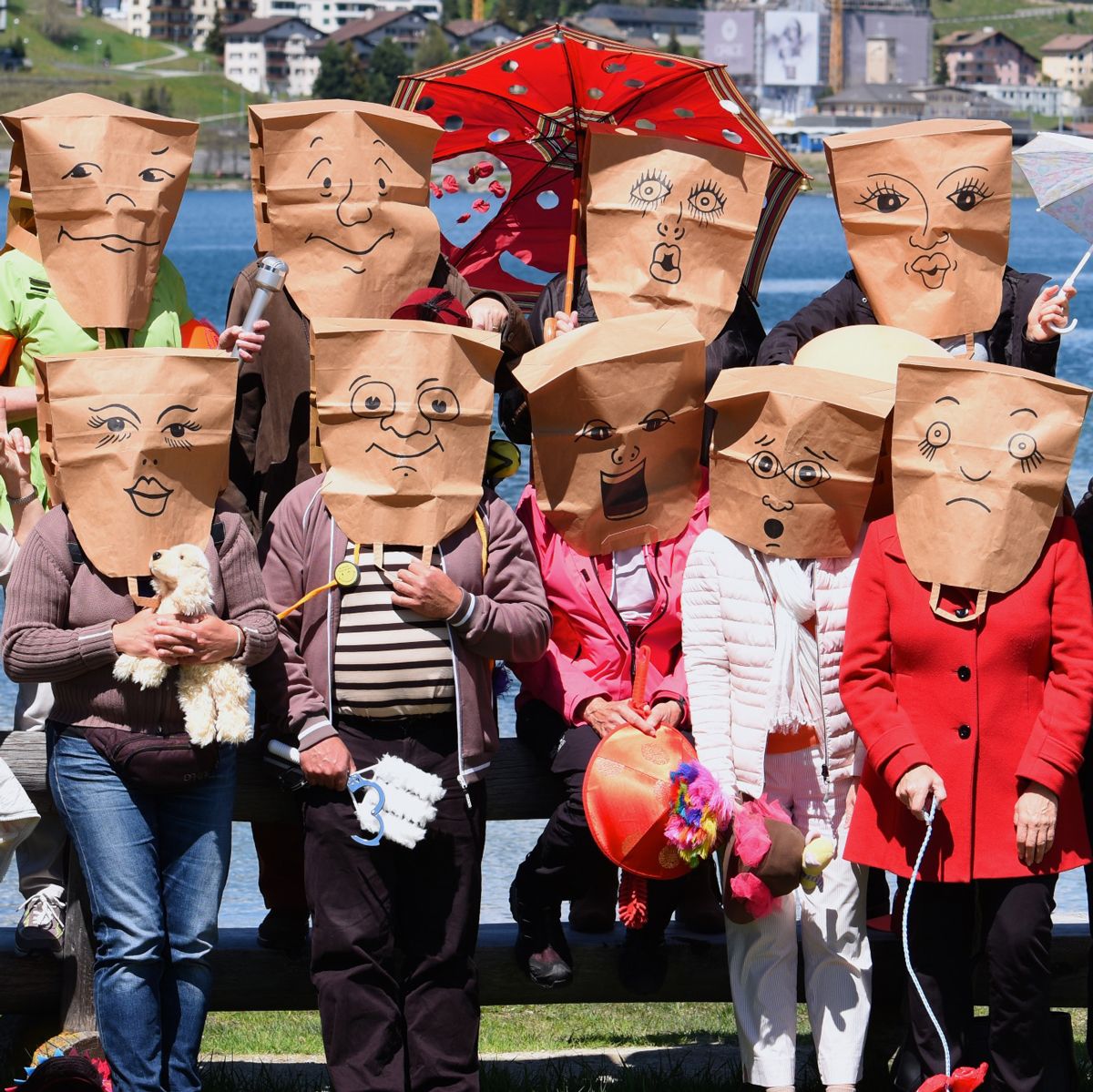 Die «LachsemiNarristen» aus dem St. Moritzer Wochenendkurs in narrativer Aktion. Foto: Ursula Hersberger