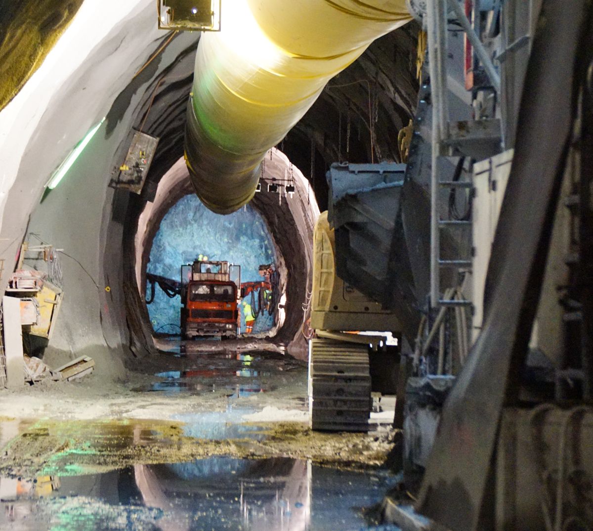 Staub, Dreck, Schlamm, Wasser, Kunstlicht und Lärm sind die Hauptbegleiter der Mineure im Stollen Süd des neuen Albulatunnels II. Foto: Jon Duschletta