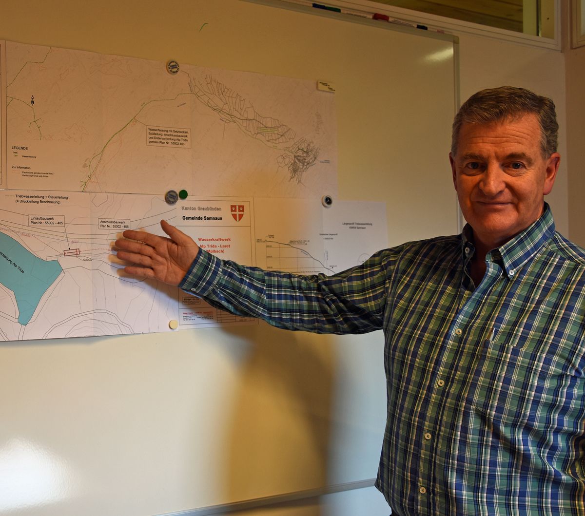 er Gemeindepräsident von Samnaun, Hans Kleinstein, zeigt voller Stolz die Pläne für das Kleinkraftwerk Alp Trida – Laret (Foto: Nicolo Bass).