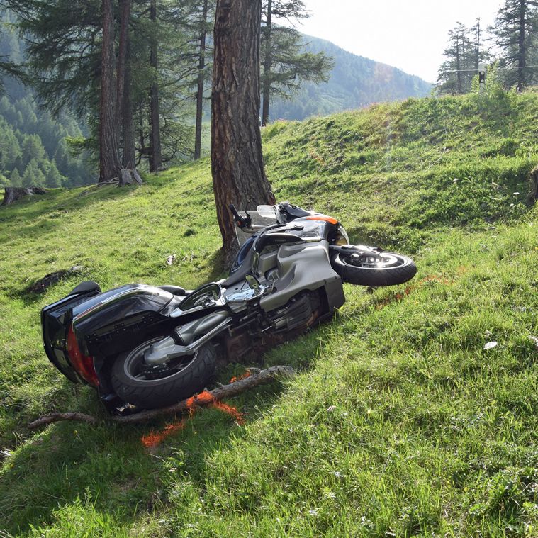 Der Motorradlenker stürzte die Böschung hinunter und kollidierte mit einem Baum. Foto: Kantonspolizei Graubünden