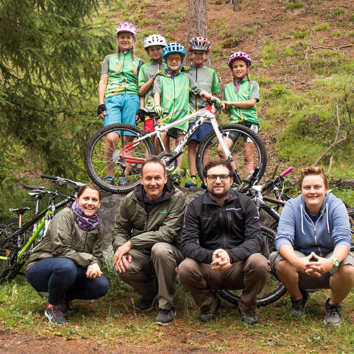 Martina Hänzi, Claudio Duschletta, Claudio Daguati e Chantal Mayor (davant da schnestra) dal comité d'organisaziun s'allegran sül Bike-maraton intuorn il parc naziunal. Eir per la generaziun giuvna da bike esa pisserà (fotografia: Niculin Meyer).