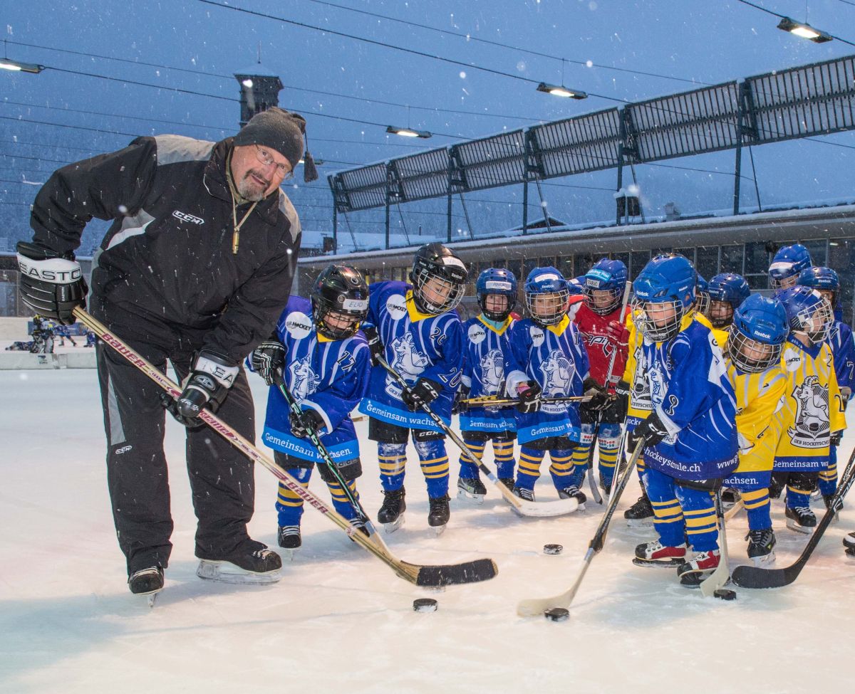 Trainer Renato Micheli mit den jüngsten Eishockeyanern. Foto: fotoswiss.com/Cattaneo