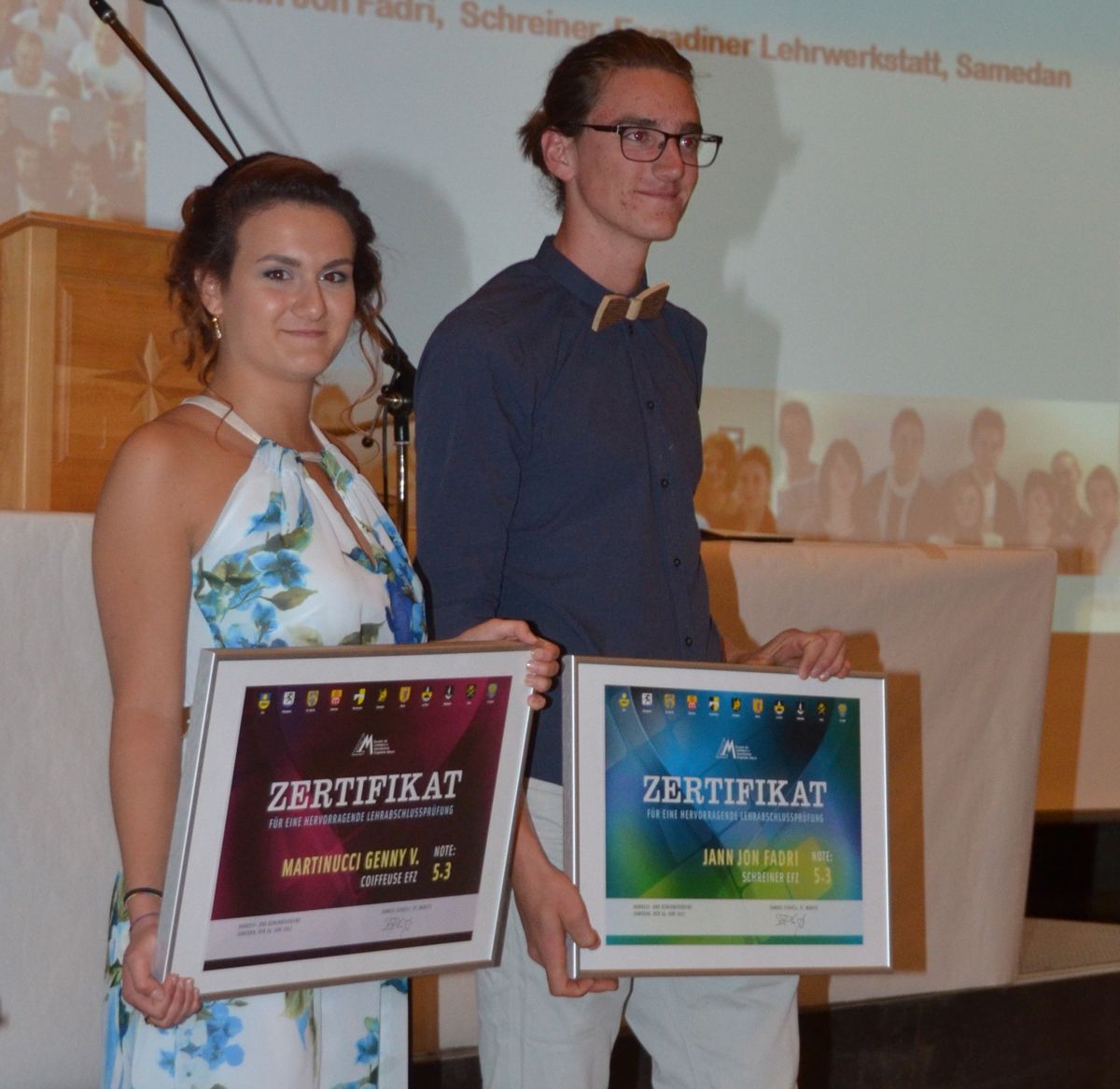 Die Coiffeuse Genny Martinucci und der Schreiner Jon Fadri Jann klassierten sich im kantonalen Rang. Auf dem Bild fehlt Carla Wyssmann. Foto: Björn Burkhard