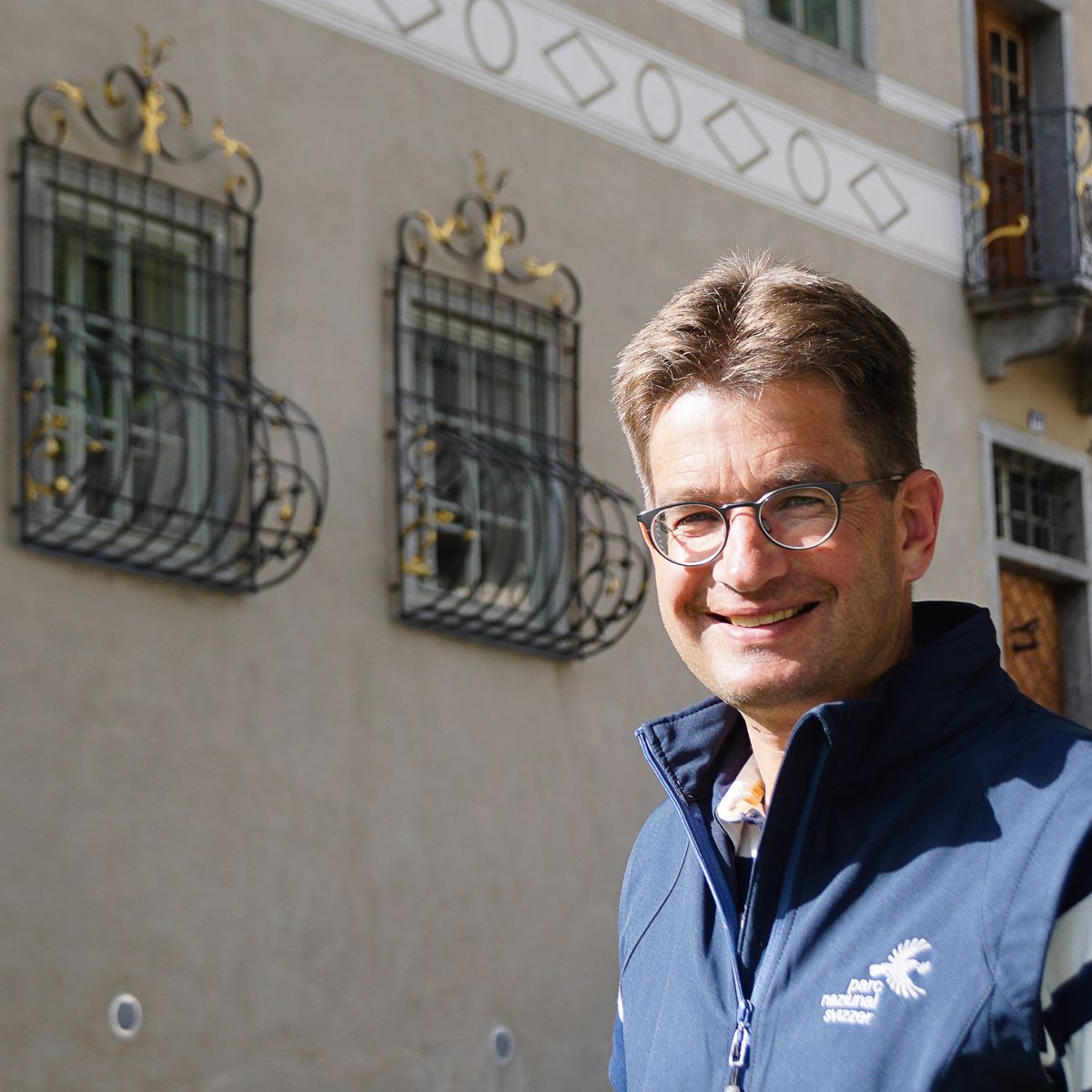 Der Kommunikationsprofi Stefan Triebs vom Schweizerischen Nationalpark steht hinter der Organisation des Kino-Openairs und schwört auf das lauschige Ambiente des Zernezer Schlosshofes. Foto: Jon Duschletta