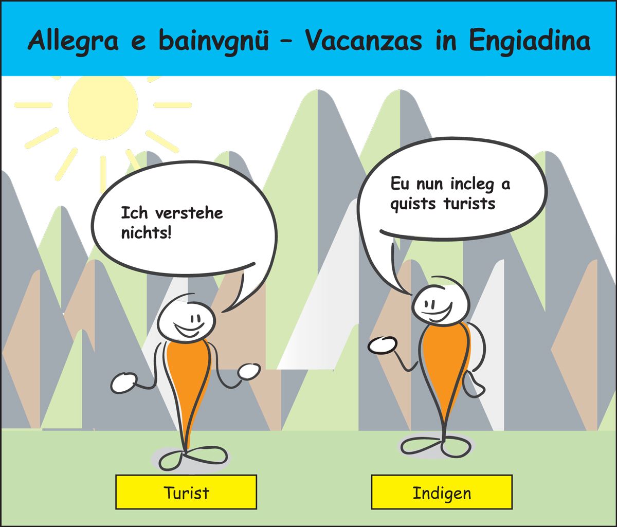 Recloma per la destinaziun dess gnir incletta dal giast. Ma Niculin Meyer appellescha da nu müdar subit la lingua cur ch’ün giast prouva da discuorrer rumantsch, quai saja part da la regiun (comic: Posta Ladina/Fotolia.com/strichfiguren.de).