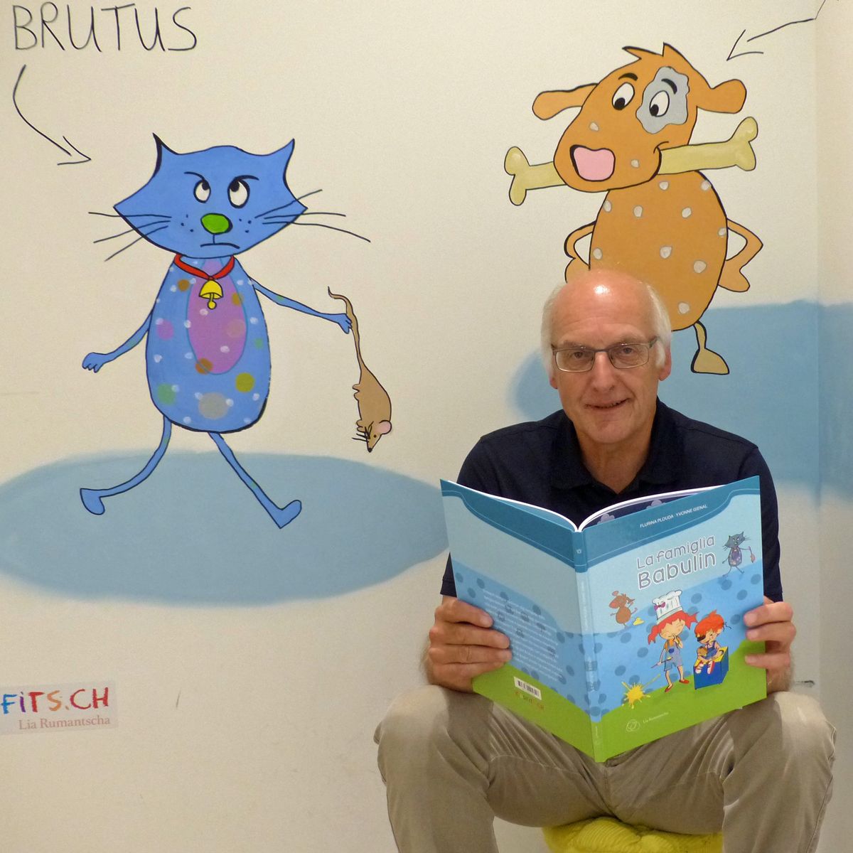 Il promotur regiunal Mario Pult muossa il nouv chantun pels uffants e la «Famiglia Babulin», il resultat d’ün dals progets da la Lia Rumantscha per famiglias (fotografia: Flurin Andry).
