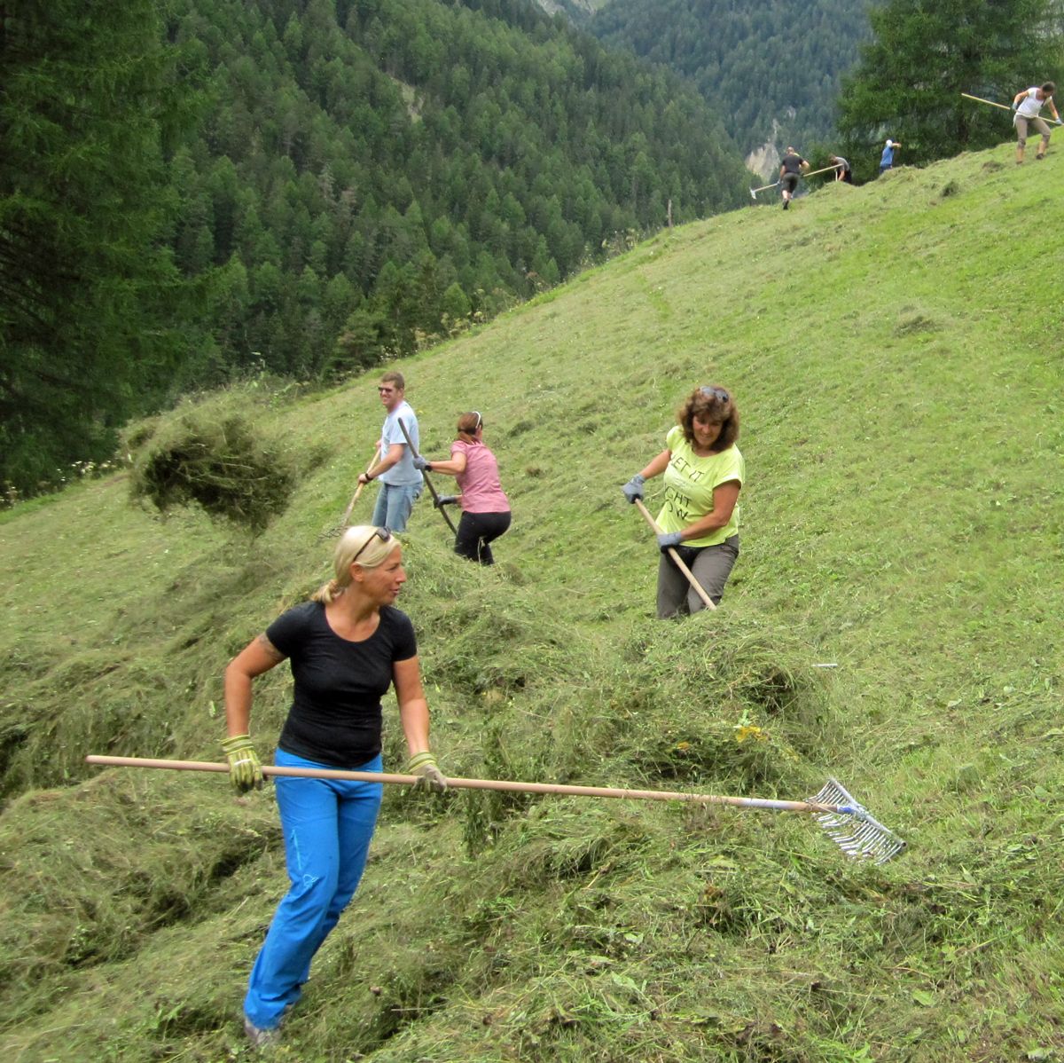 Ils partecipants dals dis activs illa natüra güdan per exaimpel a far cun fain (fotografia: Angelika Abderhalden).