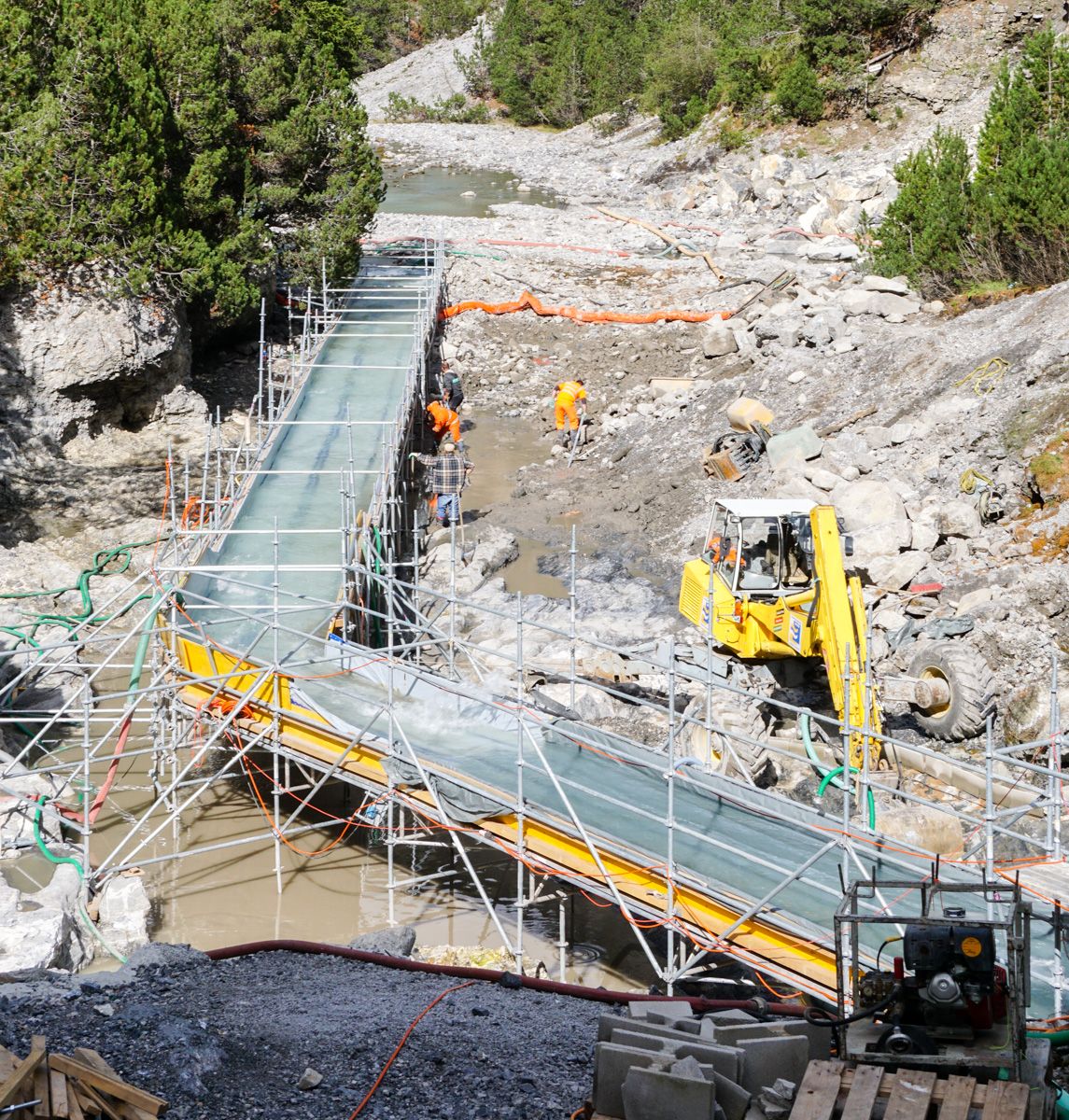 Das PCB-kontaminierte Sediment wird im Tosbecken bis auf den Felsuntergrund abgetragen und vor Ort behandelt. Derweil fliesst das Restwasser über eine Notbrücke. Foto: Jon Duschletta