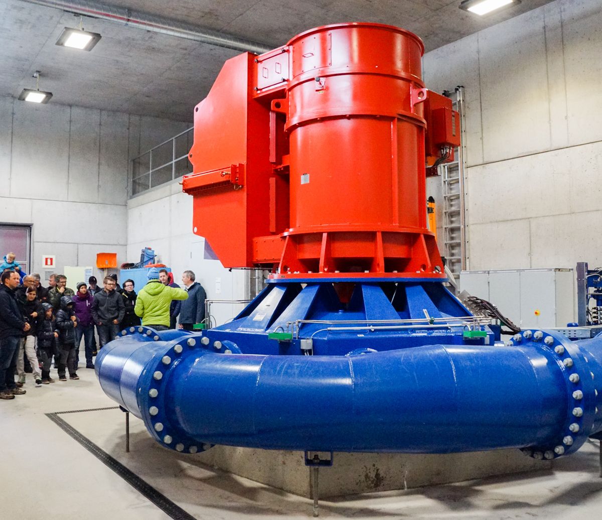 Blick in die Kraftwerkszentrale Morteratsch: Von rechts kommend treibt das Wasser via Druckleitung (blau) und über fünf Wasserdüsen die in der Mitte liegende Peltonenturbine an. Darüber liegt der rot bemalte Stromgenerator. Foto: Jon Duschletta