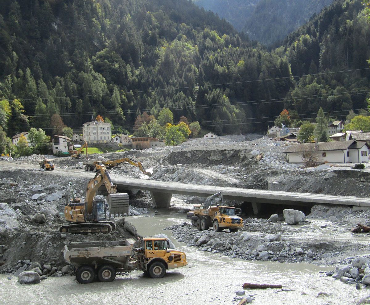 Der Stand der Arbeiten am Sonntag gegen Mittag: die Bondasca läuft wieder unter der Brücke, die über eine weite Stecke frei ist. Foto: Katharina von Salis