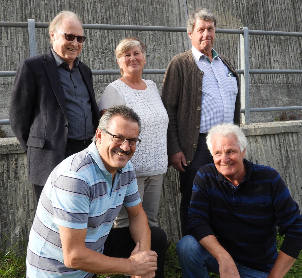 La suprastanza da l’Uniun da veterans da musica cun Josef Schaniel, Evelina Lehner e Gion Ragethli (davovart da schnestra) e Claudio Cajacob e Gaudenz Lütscher (davantvart da schnestra) (fotografia: Annatina Filli).