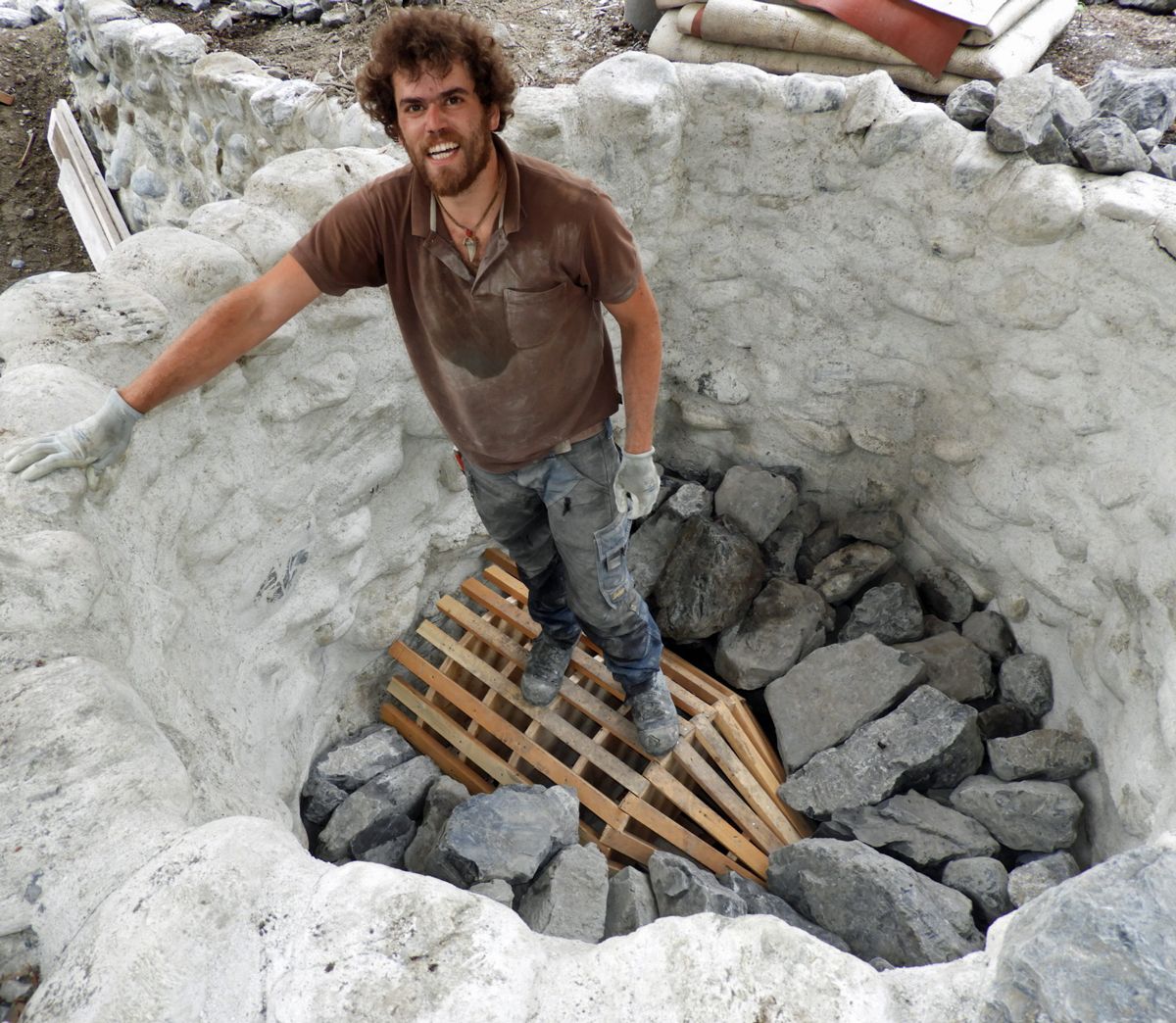Joannes Wetzel, il specialist per chaltschina, lova la crappa per restaurar la chalchera a Sur En (fotografia: Annatina Filli).