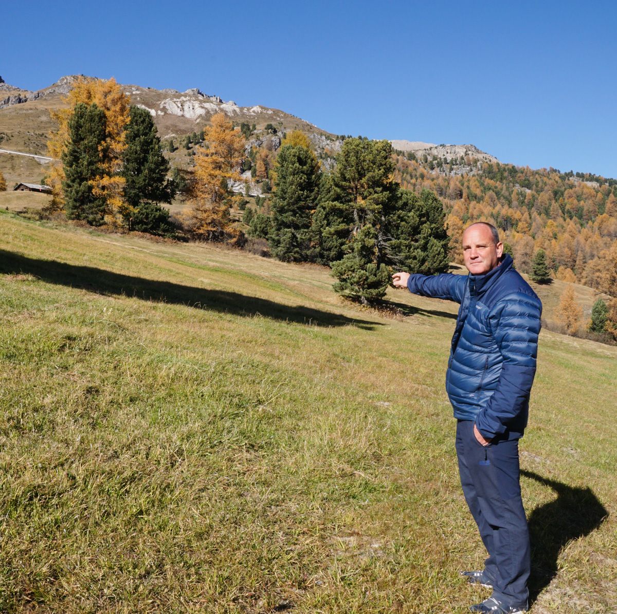Guido Mittner steht auf der renaturierten Wiese, wo während der Ski-WM die grosse IBC-Container-Plattform stand. Foto: Jon Duschletta