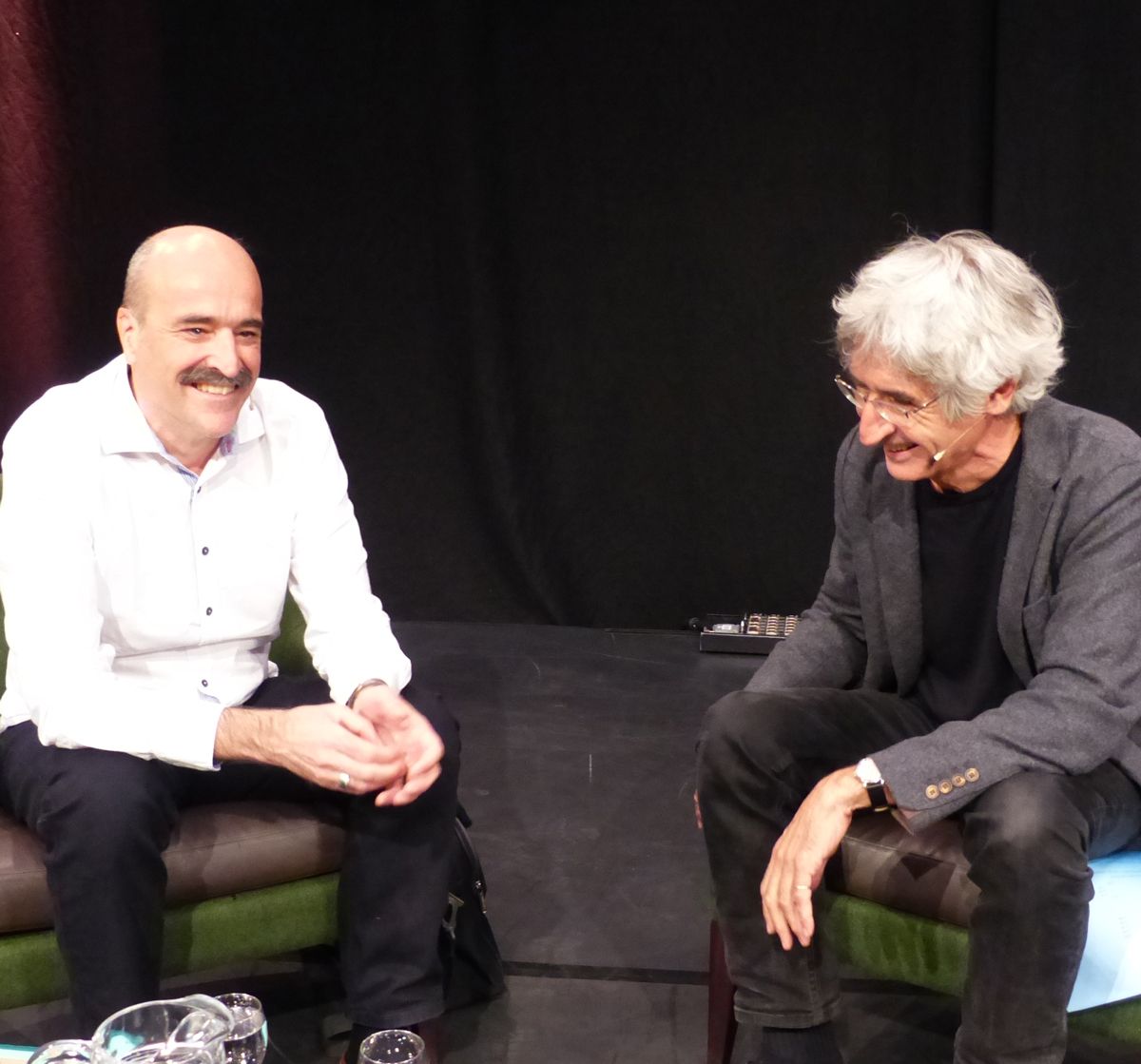 Il poet Dumenic Andry (a schnestra) ed il moderatur Clà Riatsch han discuorrü davart il cudesch da poesias «sablun» (fotografia: Flurin Andry).