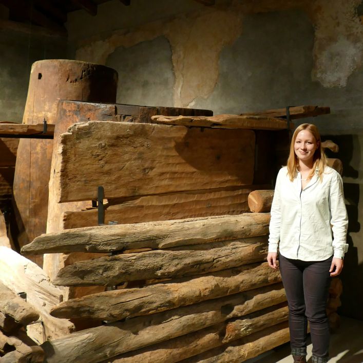Monika Oberhänsli, Mitarbeiterin des Archäologischen Dienstes Graubünden und Autorin des neuen Buches, vor der bronzezeitlichen Quellfassung im Paracelsusgebäude in St. Moritz. Foto: z.Vfg