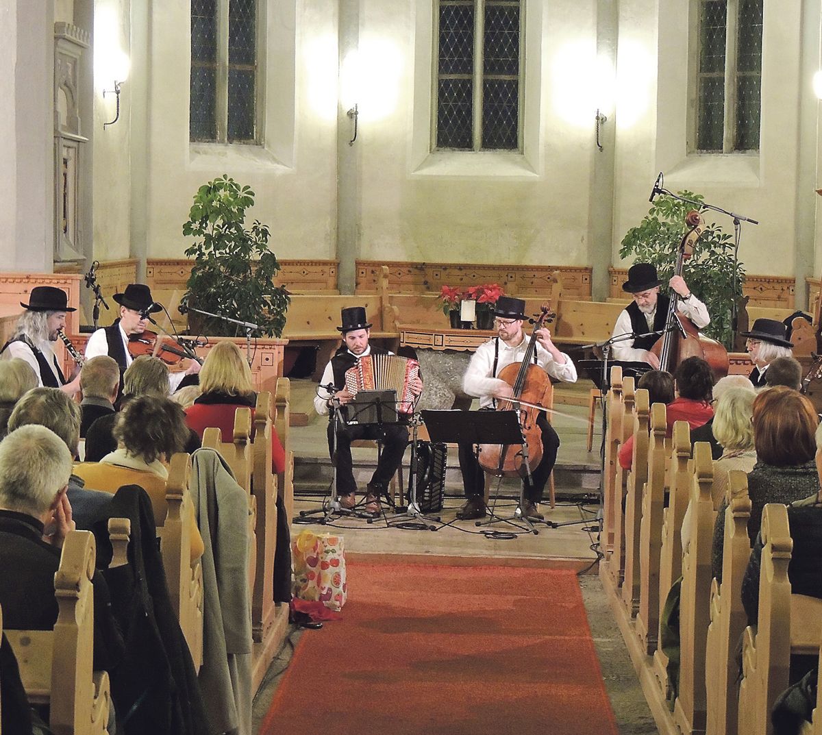La «Hanneli-Musig» ha concertà illa baselgia San Lurench a Sent. Da schnestra: Johannes Schmid, Dani Häusler, Fränggi Gehrig, Fabian Müller, Ueli Mooser e Christoph Mächler. (fotografias: Benedict Stecher)