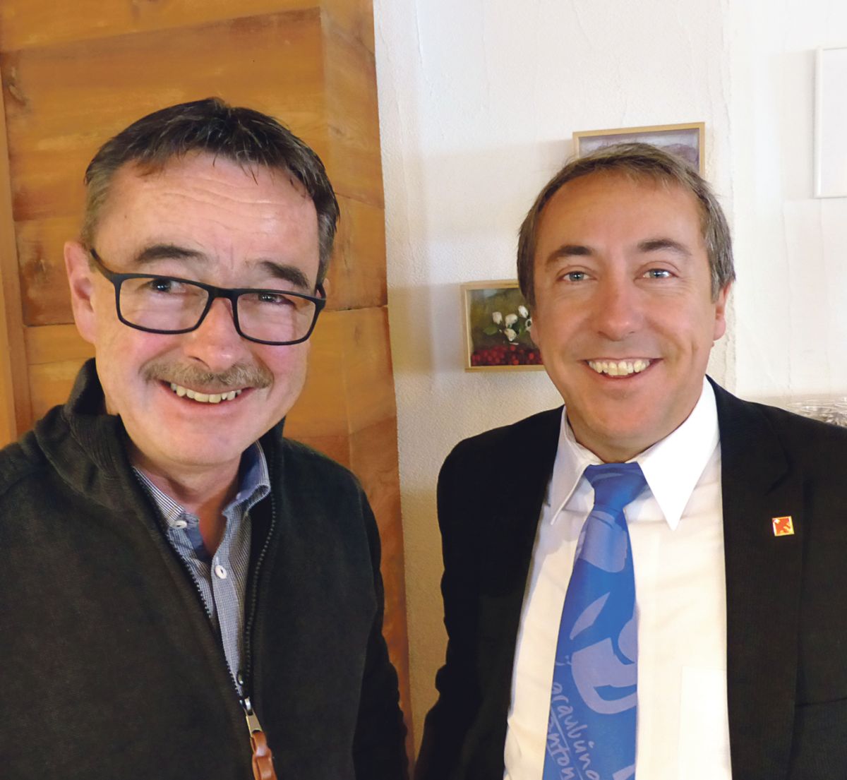 Jachen Kienz, il president dal district da musica 1 (a schnestra), cul giast Andy Kollegger chi presidiescha l’Uniun chantunala da musica. (fotografia: Flurin Andry)