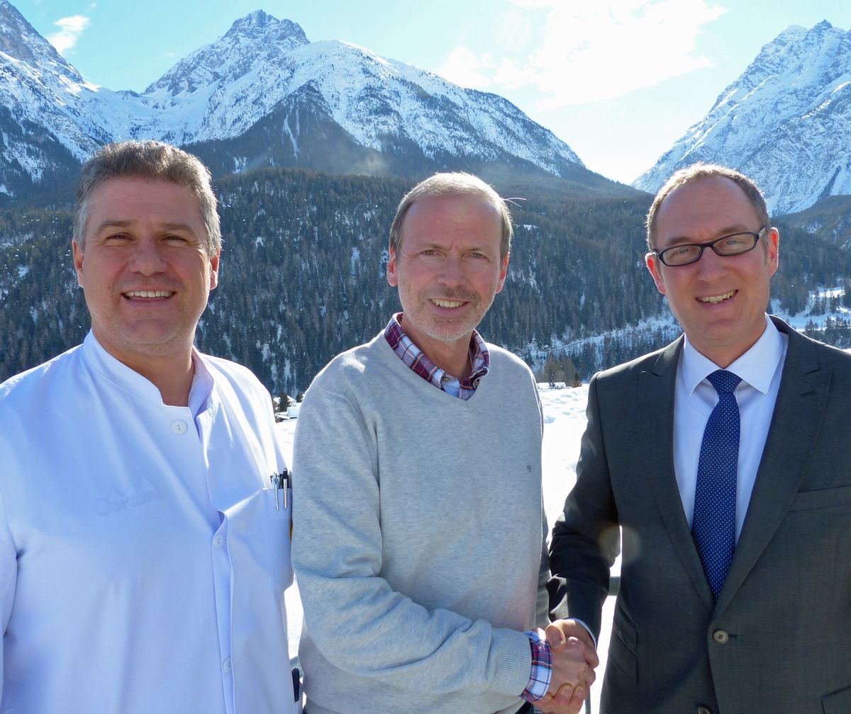 Joachim Koppenberg e Philipp Gunzinger (da schnestra) ingrazchan al cusglier guvernativ Christian Rathgeb pel sustegn da vart dal Chantun pels ospidals regiunals (fotografia: Flurin Andry).