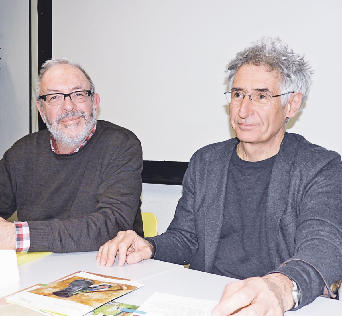Ils duos perits da la lingua rumantscha Chasper Pult (a schnestra) e Clà Riatsch han invidà ad üna sairada da nom e da pom. (fotografia: Annatina Filli)
