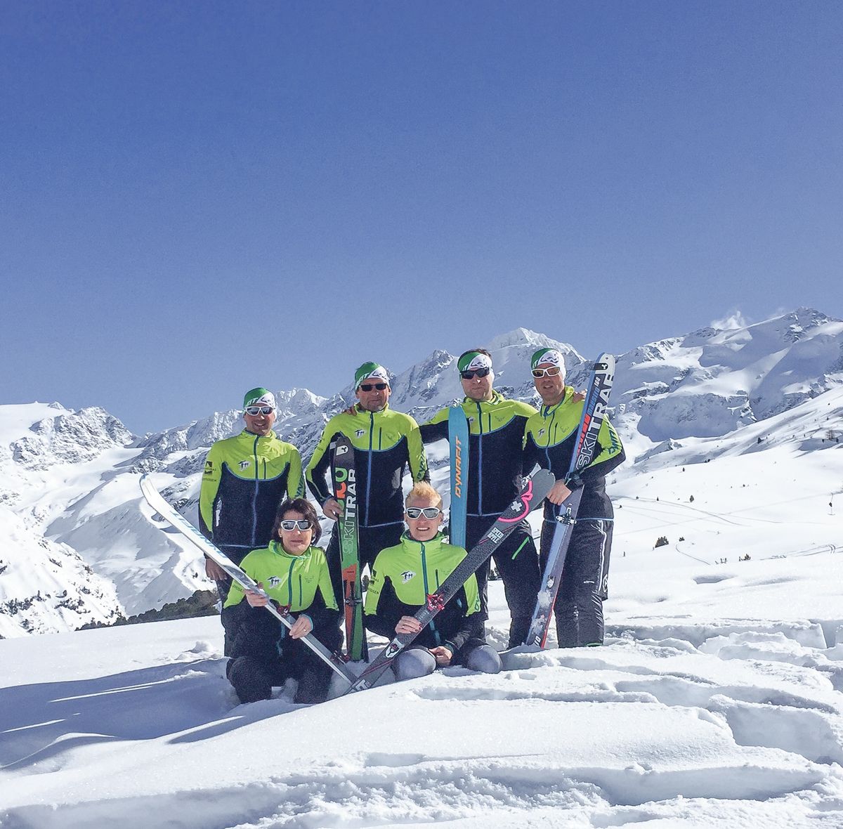 La gruppa da turas da ski «TTUmbrail» cun Renzo Zen, Marcus Cola, Armon Fallet, Sergio Zen (davovart da schnestra a dretta), Cristina Uen e Manuela Zen s’allegran da pudair far trenamaints da not eir in Val Müstair. (fotografia: mad)