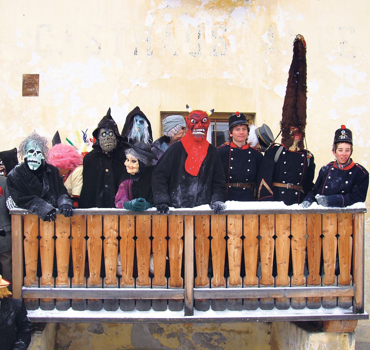 Las üsanzas da Chalandamarz as disferenzeschan: Tuottafat speciala es la cumpagnia mascrada da Chalandamarz culla bullavitra (seguond da dretta) a Ftan. (fotografia: Mario Pult)