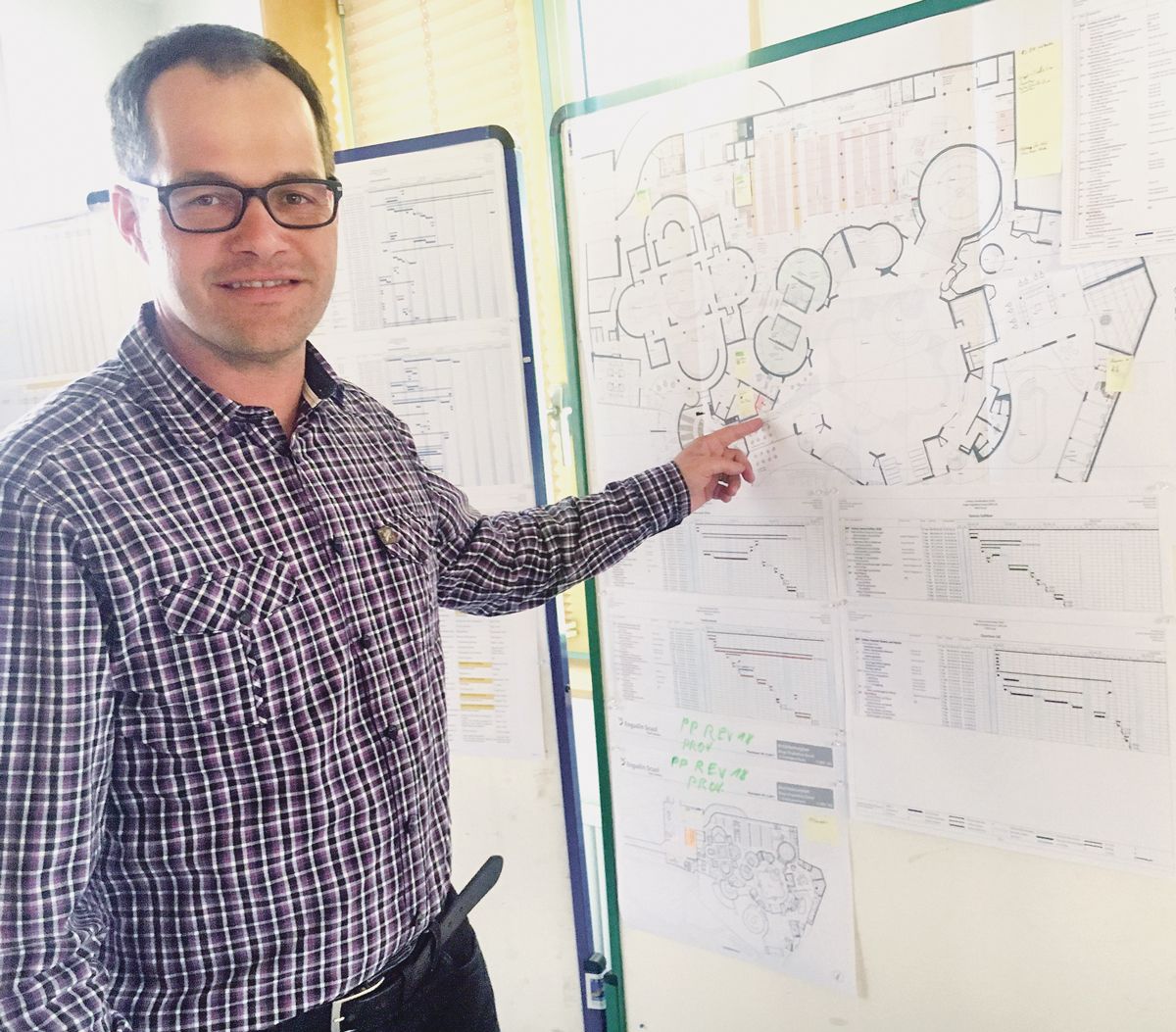 Gerhard Hauser, il directer dal Bogn Engiadina Scuol, preschainta la planisaziun minuziusa, dal proget da fabrica chi cumainza als 9 avrigl e finischa la fin da mai. (fotografia: Nicolo Bass)