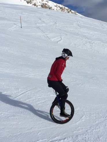 Die mehrfache Weltmeisterin und Weltrekordhalterin im Einradfahren, Mirjam Lips aus Champfèr, bewies ihr Können auch auf der Skipiste. Das Ganze fand nach 16.00 Uhr statt, als die Pisten bei Trais Fluors für Skifahrer bereits geschlossen waren.