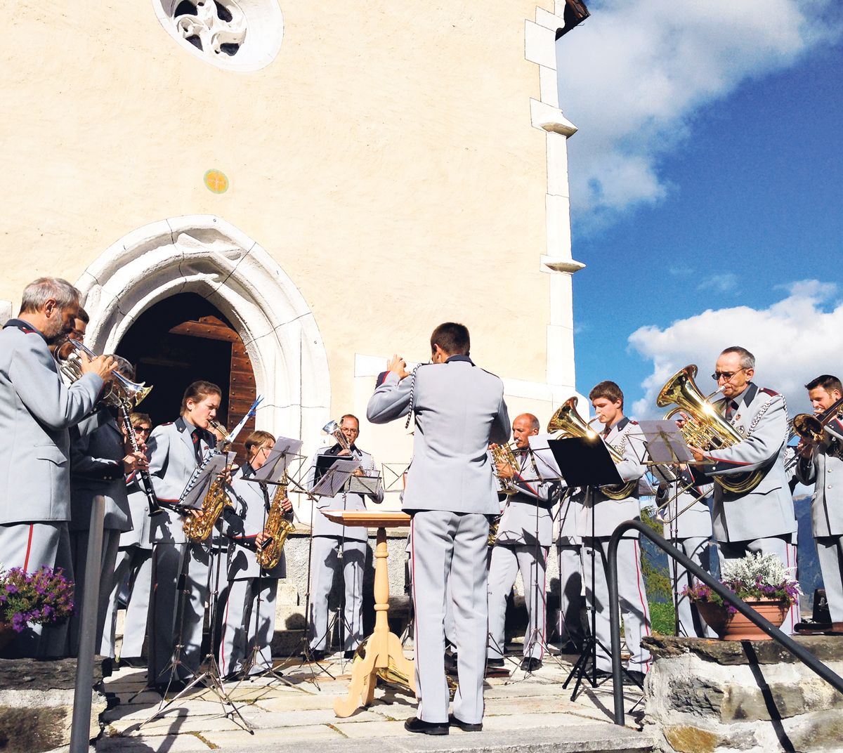 La musica da Tschlin, qua suot la bachetta da Curdin Caviezel, imbellischa adüna darcheu las festas cumünalas cun sias melodias. (fotografia: Flurin Andry)