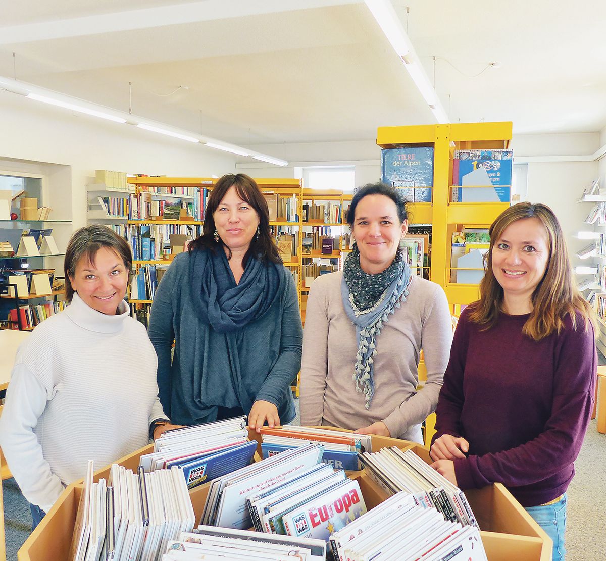 Las bibliotecaras da Scuol, Katrin Tissi, Corinne Voney, Barbara Portmann ed Annatina Melcher (da schnestra) han constatà cha’ls films sün DVD nu sun plü uschè retscherchats. (fotografia: Flurin Andry)