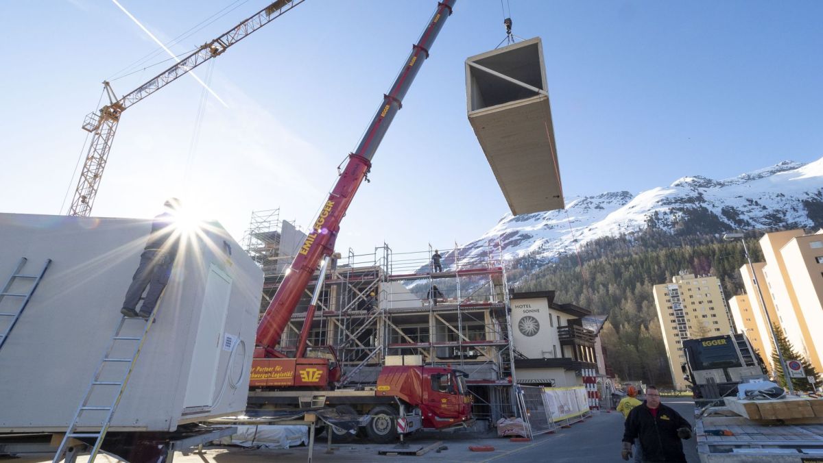Es ist bald Halbzeit beim Umbau des Hotels Sonne in St. Moritz Bad. Es muss schnell gehen, also setzt die Bauherrschaft auf das System vorfabrizierter Zimmer