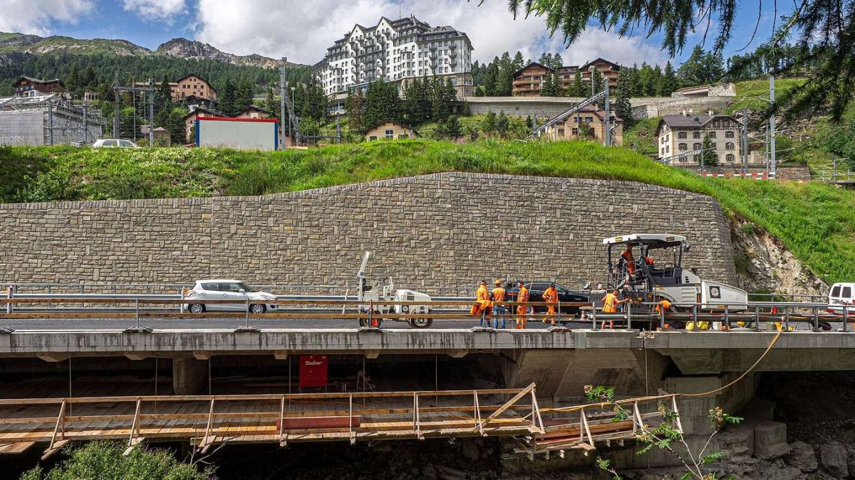 Die Engadinerstrasse zwischen St. Moritz und Celerina ist eine der stärkst befahrenen Kantonsstrassen Graubündens. Die Baustelle in der Charnadüra führt zu Rückstaus. Per Handregelung wird versucht, die Wartezeiten zu minimieren.
