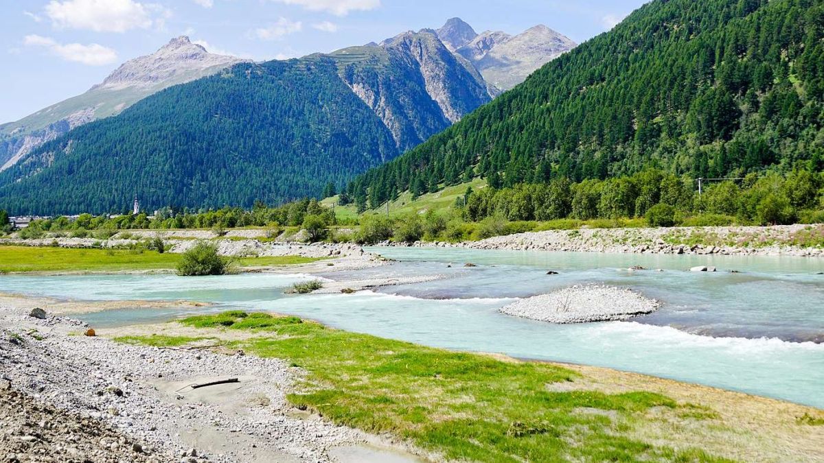 Unterhalb von Bever wird der alte Inndamm (Bildmitte) im Rahmen der Inn-Revitalisierung rückgebaut. Foto: Jon Duschletta