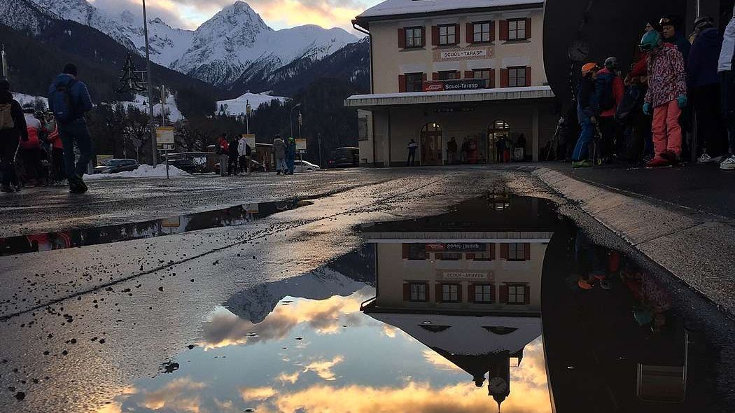 La staziun da Scuol a Silvester pro l’ultim tramunt dal sulai da l’on (Foto: Markus Enzler).