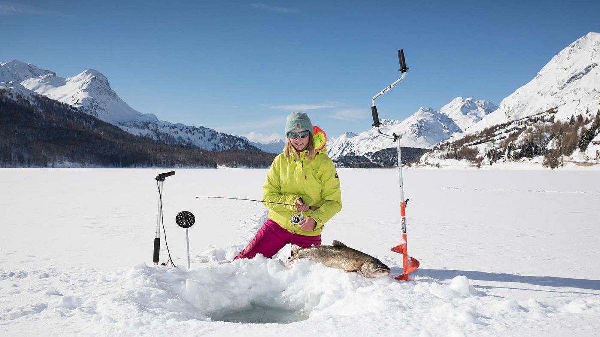Fischerinnen-Glück: Im zweiten Versuchsjahr der Eisfischerei auf dem Silsersee wurden deutlich mehr grosse Namaycushs gefangen, wie diese junge Fischerin auf dem Bild unter Beweis stellt. Foto: www.engadin-foto.ch/Claudio Gotsch