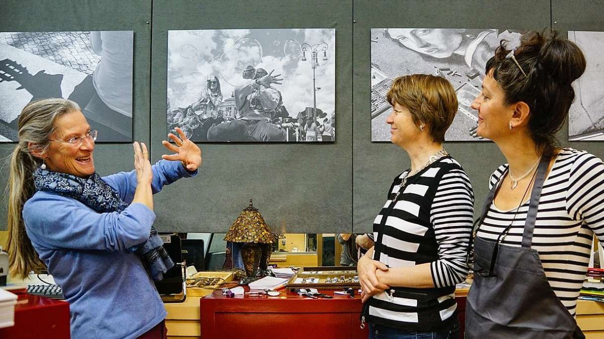 Die passionierte Fotografin Christine Hübner-Berlepsch (von links) im Gespräch mit Goldschmiedin Iris Hügel von der Butia d’Or in Samedan und ihrer Mitarbeiterin Helena Armaos. Foto: Jon Duschletta