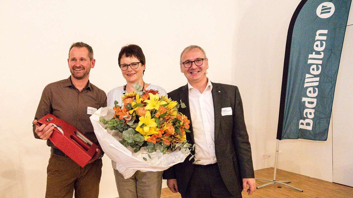 GTW-Präsident Thomas Beck (rechts) zusammen mit den Organisatoren der Herbstversammlung, Roger und Karin Tremp der Hosang Sanitär AG in Zuoz. Foto: Jon Duschletta