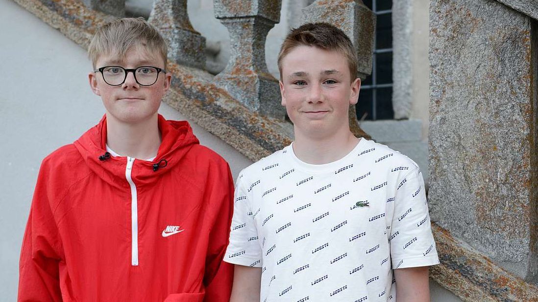 Lucas Candinas (a schnestra) e Fabio Lehner in occasiun da la premiaziun da la concurrenza da scriver «pledpierla» a Zernez (fotografia: Reto Stifel).