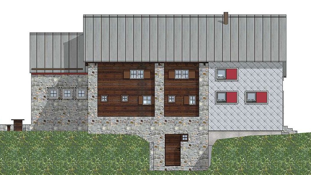 Die Ansicht von Nordost. Rechts der neue Anbau, welcher im Holzelementbau erstellt und mit Metallblechen verkleidet wird. Modellfoto: Ernst Huber