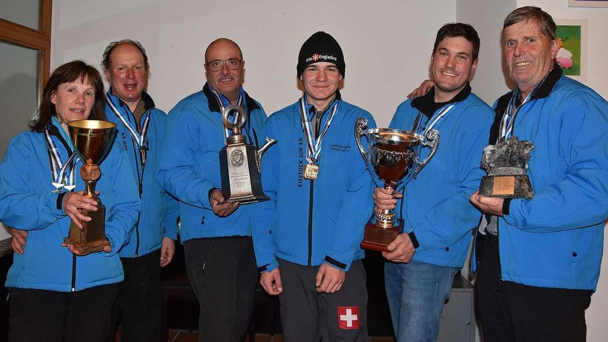 Alle Wandertrophäen der Eisstock-Bündnermeisterschaft bleiben in Sur En. Von links: Erica Koch, Jon Curdin Cantieni, Otto Davaz, Orlando Bass, Claudio Mathieu und Giacinto Mayer (Foto: Nicolo Bass).