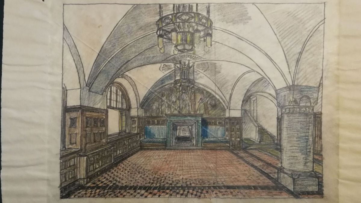 Emil Weber war auch ein guter Zeichner, wie diese Zeichnung von der Halle des Hotels La Margna St. Moritz belegt.