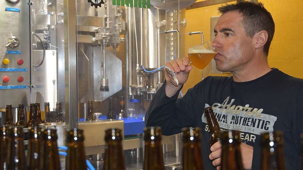 Il manader da la Bieraria Tschlin SA, Reto Rauch, insaja la prüma biera da chonv (fotografia: Nicolo Bass).