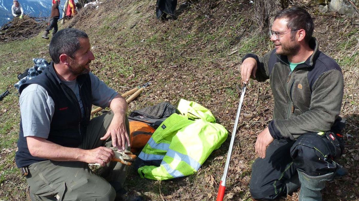 Il guardgiasulvaschina Curdin Florineth (a schnestra) in discussiun cun Andri Bazzell da la società da chatschaders Fasch’Alba (fotografia: Flurin Andry).