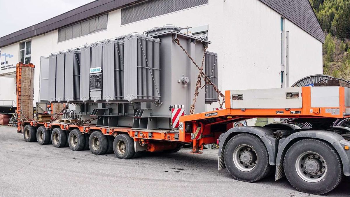Am Dienstag wurde ein 54-Tonnen-Transformator mittels Spezialtransport zum Unterwerk Zernez der Engadiner Kraftwerke AG angeliefert und in der Folge an seinen zukünftigen Standort gehievt und dort elektrisch angeschlossen. Foto: Jon Duschletta