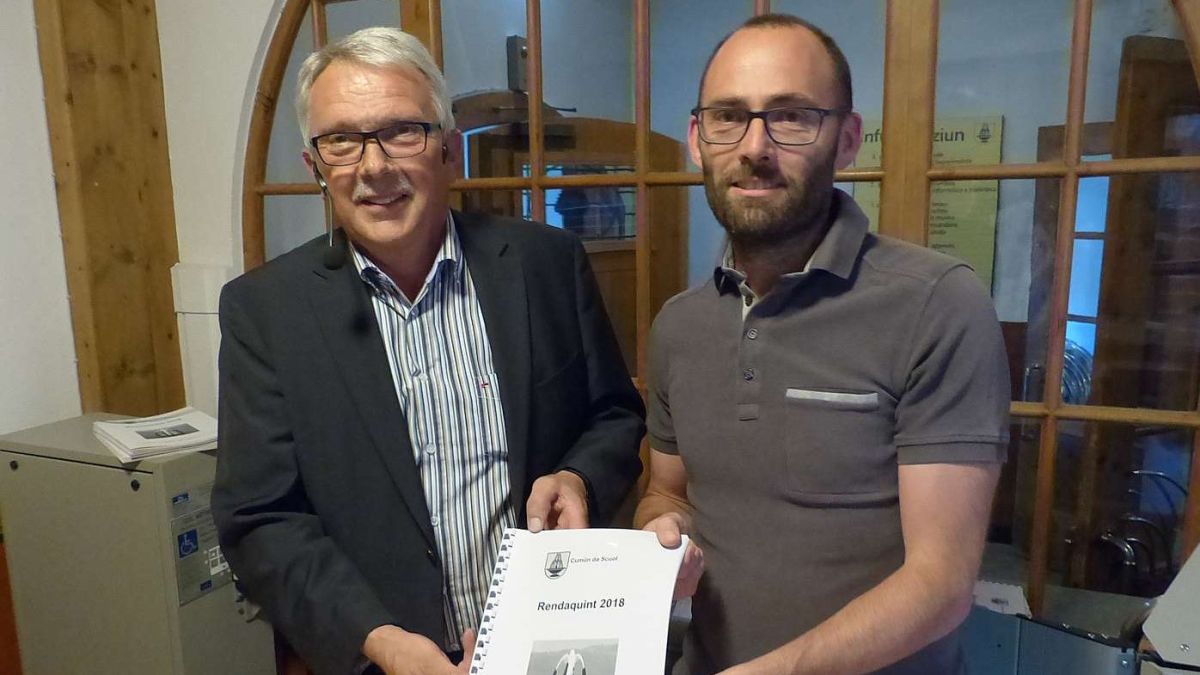 Il capo da Scuol Christian Fanzun (a schnestra) e Michel Taisch, il schef da las finanzas cumünalas, cul rendaquint 2018. (fotografia: Flurin Andry)