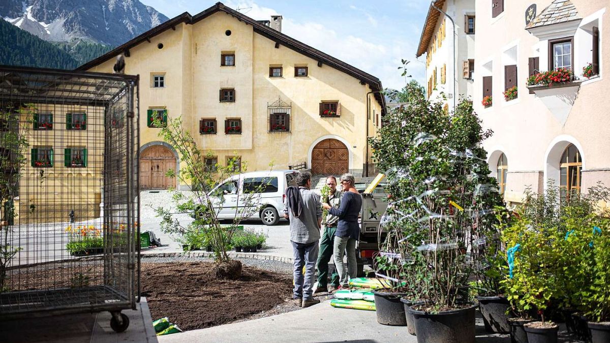 Ob wohl die Kübelpflanzen, die hier angepflanzt werden sollen, etwas mit dem Fest der Romanen zu tun haben? Denn dann wäre das irgendwie etwas wie mit dem Rumantsch Grischun: etwas Fremdes wird eingepflanzt...ich mag sie eigentlich nicht mehr sehen, diese grossen Büsche und Bäume, die man von irgendwoher herfährt und einpflanzt. Das ganze Oberengadin ist inzwischen voll davon. Hier sind es mindestens Laubpflanzen — anderswo gibt's rechte Arven- und Legföhrenghettos.