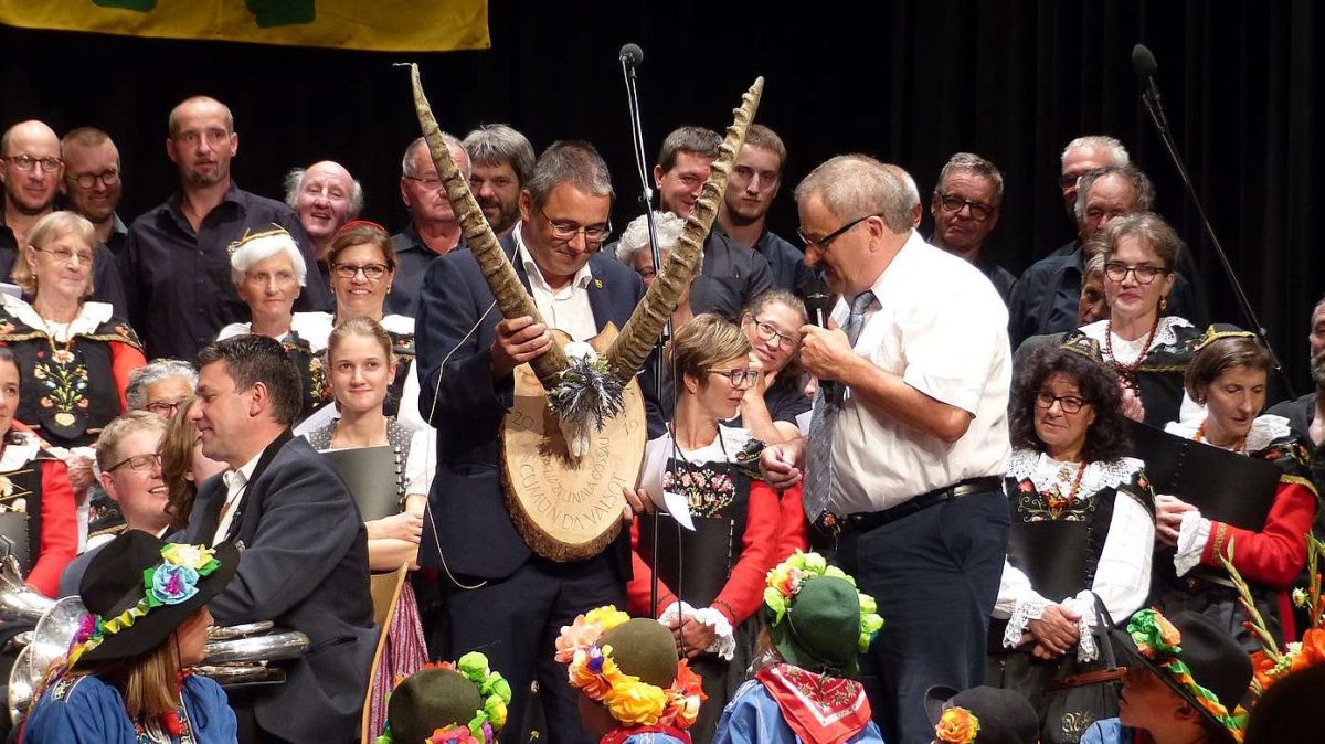 A la fin da la sairada ha regalà il capo da Valsot, Victor Peer, al president da Gossau Wolfgang Giella ün pêr cornas da capricorn. (fotografia: Victor Peer)