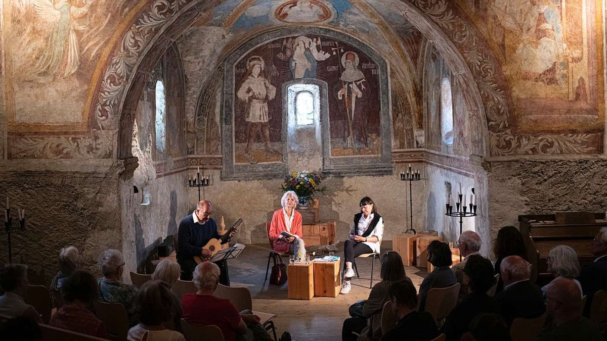 Elena Wullschleger (a schnestra) e Nina Dazzi haun prelet illa chapella da San Bastiaun poesias dad Irma Klainguti. (fotografia: Lia Rumantscha/Mayk Wendt)