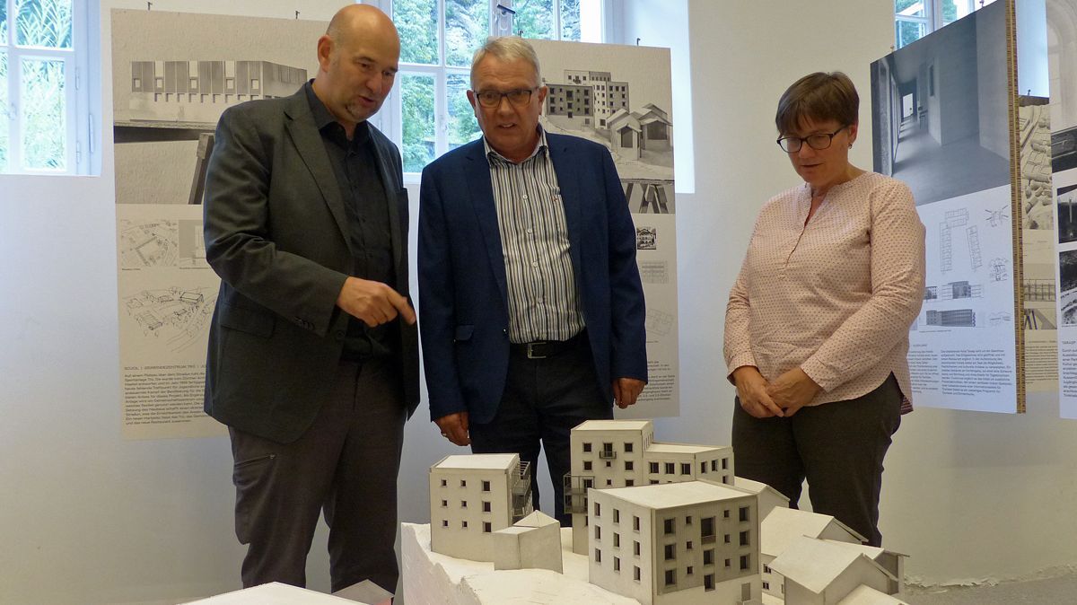 Il professer Roger Boltshauser (da schnestra), il capo cumünal da Scuol Christian Fanzun e la grondcusgliera Aita Zanetti discutan la proposta dad ün dals students. (fotografia: Flurin Andry)