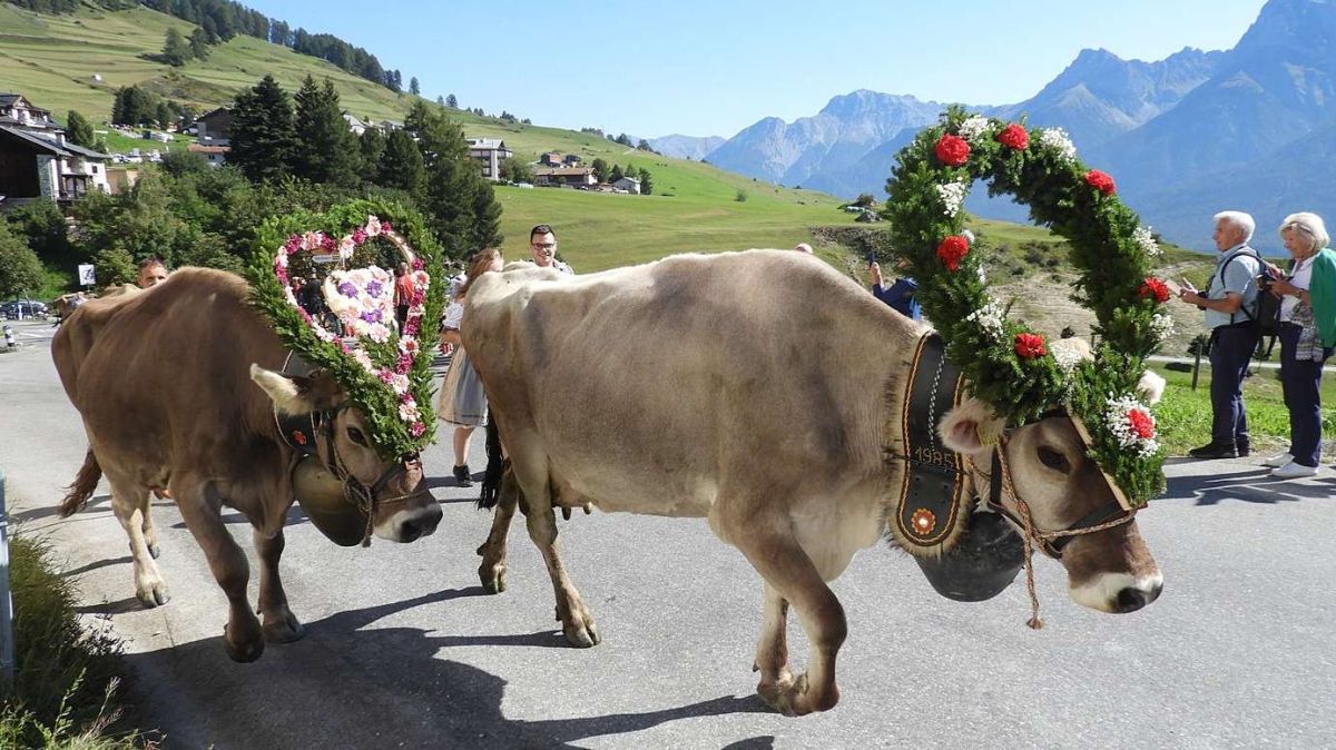 Las vachas ornadas cun cranzs da fluors sun rivadas a Ftan. Daspö quindesch ons passainta la famiglia dad Andreas Gufler las stads sün l’Alp Laret sur Ftan. (fotografia: Annatina Filli)