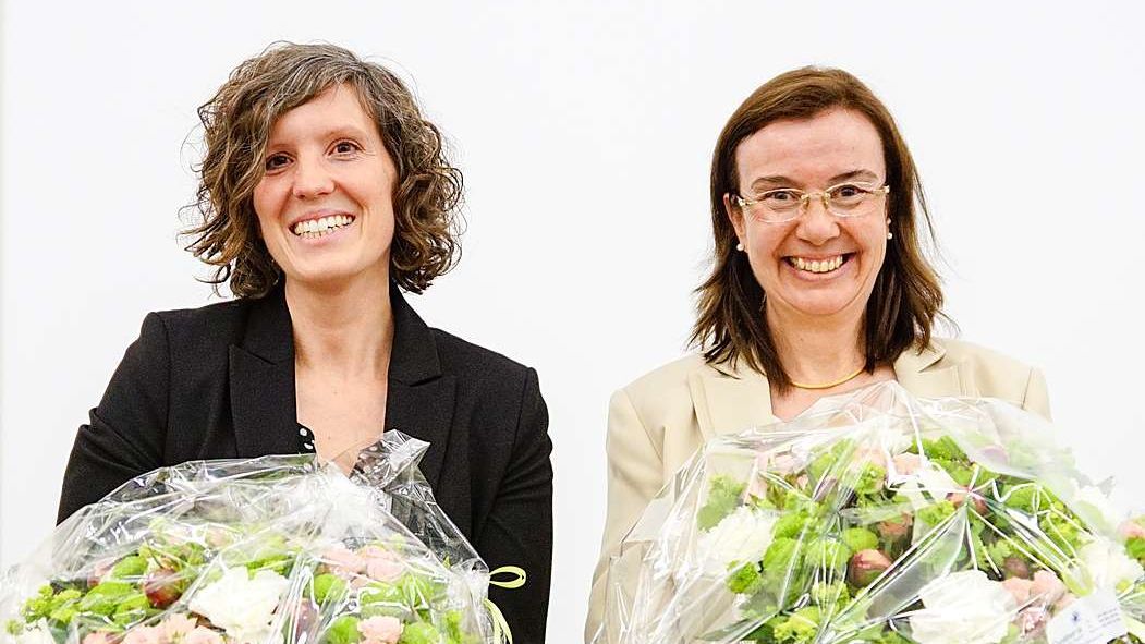 Martina Peretti (a schnestra) e sia successura illa suprastanza cumünala da Zernez, Brigitta Enkerli. fotografia: Jon Duschletta